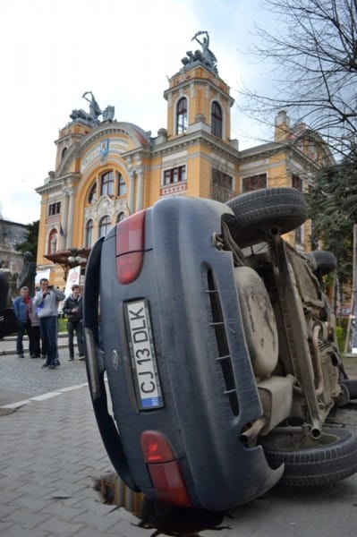 O mașină s-a răsturnat ieri, în jurul orei 14.00, în fața Teatrului Național Cluj-Napoca. Unul dintre șoferi a pierdut controlul